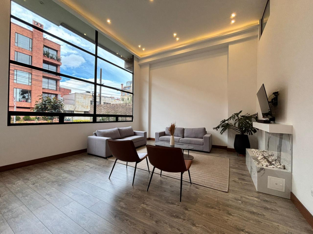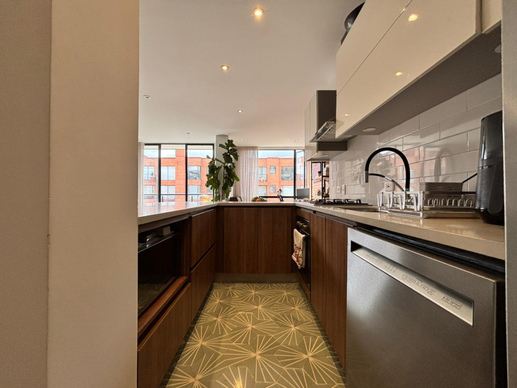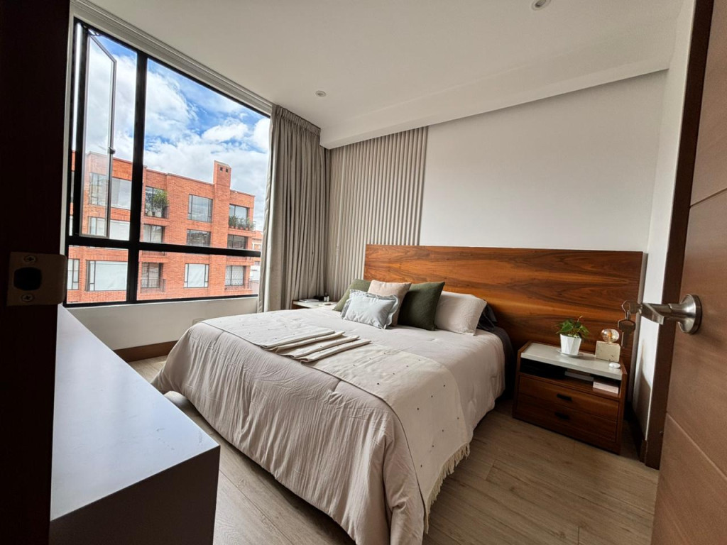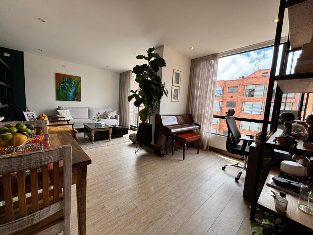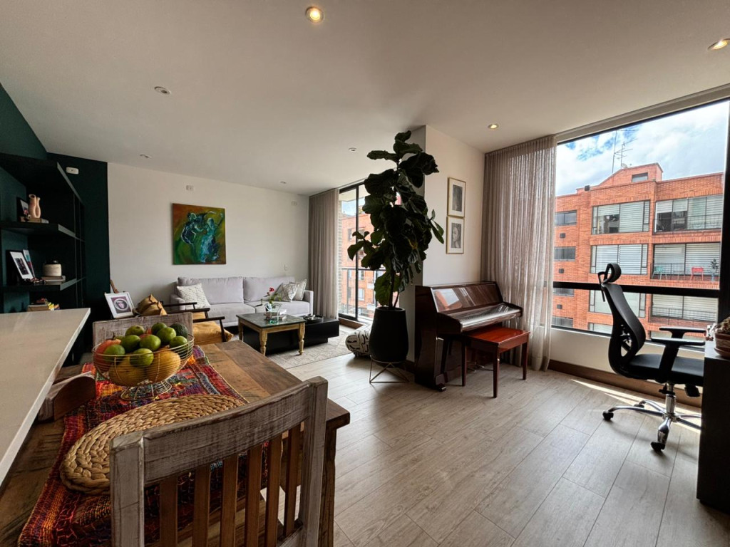 Apartamento en Venta exterior de 65 m² , ubicado en el corazón de Santa Paula , una de las zonas más apetecidas del norte de Bogotá por su tranquilidad, excelente oferta gastronómica y fácil acceso a vías principales como la Autopista Norte, la NQS y la Carrera Novena. Con techos de doble altura y amplios ventanales, este hogar se destaca por su extraordinaria iluminación natural y una sensación de amplitud difícil de encontrar en el sector. Su diseño moderno y detalles únicos —como una elegante pared verde, muros en ladrillo a la vista y mobiliarios fijos de excelente calidad— hacen que cada espacio sea funcional y a la vez lleno de carácter. El apartamento cuenta con: Distribución y áreas - Una habitación amplia y luminosa, con mueble fijo bajo la TV para mayor capacidad de almacenamiento. - Dos baños: uno social y un baño completo dentro de la habitación. - Cocina abierta y muy cómoda, equipada con horno a gas, horno eléctrico, estufa de 4 fogones, espacio para microondas y lavavajillas . - Zona de lavandería independiente , con espacio para lavadora y secadora grandes. - Calentador de agua a gas. - Balcon - Mobiliarios fijos incluidos, como una moderna biblioteca, un escritorio integrado en el estudio y el mueble de la alcoba principal. Depósito. Parqueadero: Incluye un parqueadero de 22 m² configurado en servidumbre para dos carros, ideal para aprovechar al máx