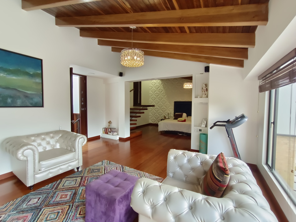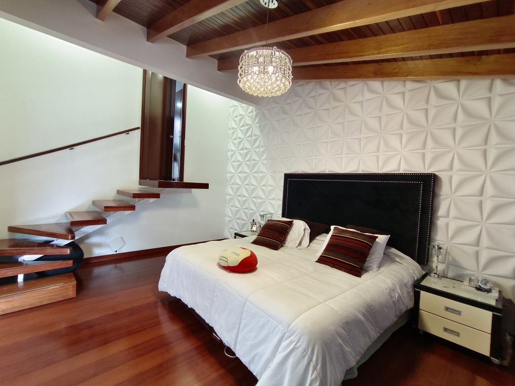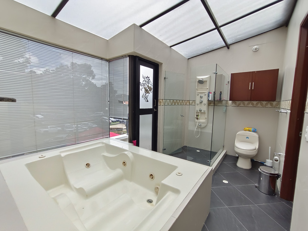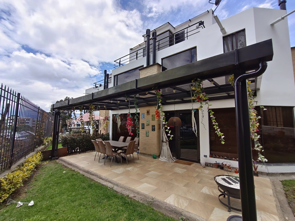 vendo Casa moderna en niveles, ubicada en los cerros orientales del norte de Bogotá, esta casa de 350 mts2, cuenta con 4 habitaciones, todas con baño en suite. Amplias zonas sociales como lo son sala con área de tv, 2 áreas de comedor independiente, cocina abierta totalmente equipada, la casa tiene turco y jacuzzi privados. En el exterior pérgola con amplias zonas verdes para que goces de momentos inolvidables en familia. Estacionamiento cubierto con cargador para vehículo eléctrico, caldera de agua caliente, piso con calefacción radiante, jacuzzi y turco en la casa. Zona para el servicio con cuarto y baño. Amplia zona de lavandería. El conjunto cuenta con capilla, CCTV, portería 24 horas, muy cerca de la carrera séptima, la calle 147 y la calle 153. Supermercados, colegios y universidades muy próximos. Ven y conoce tu nueva casa!
