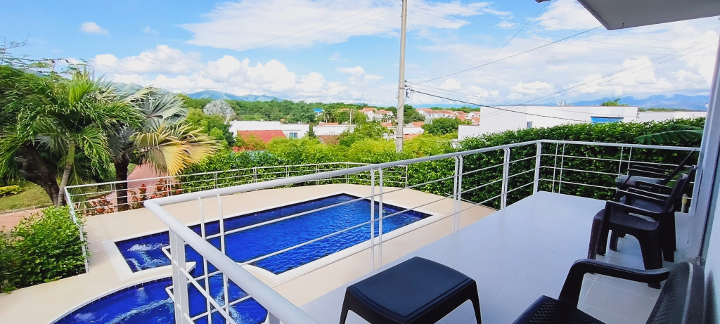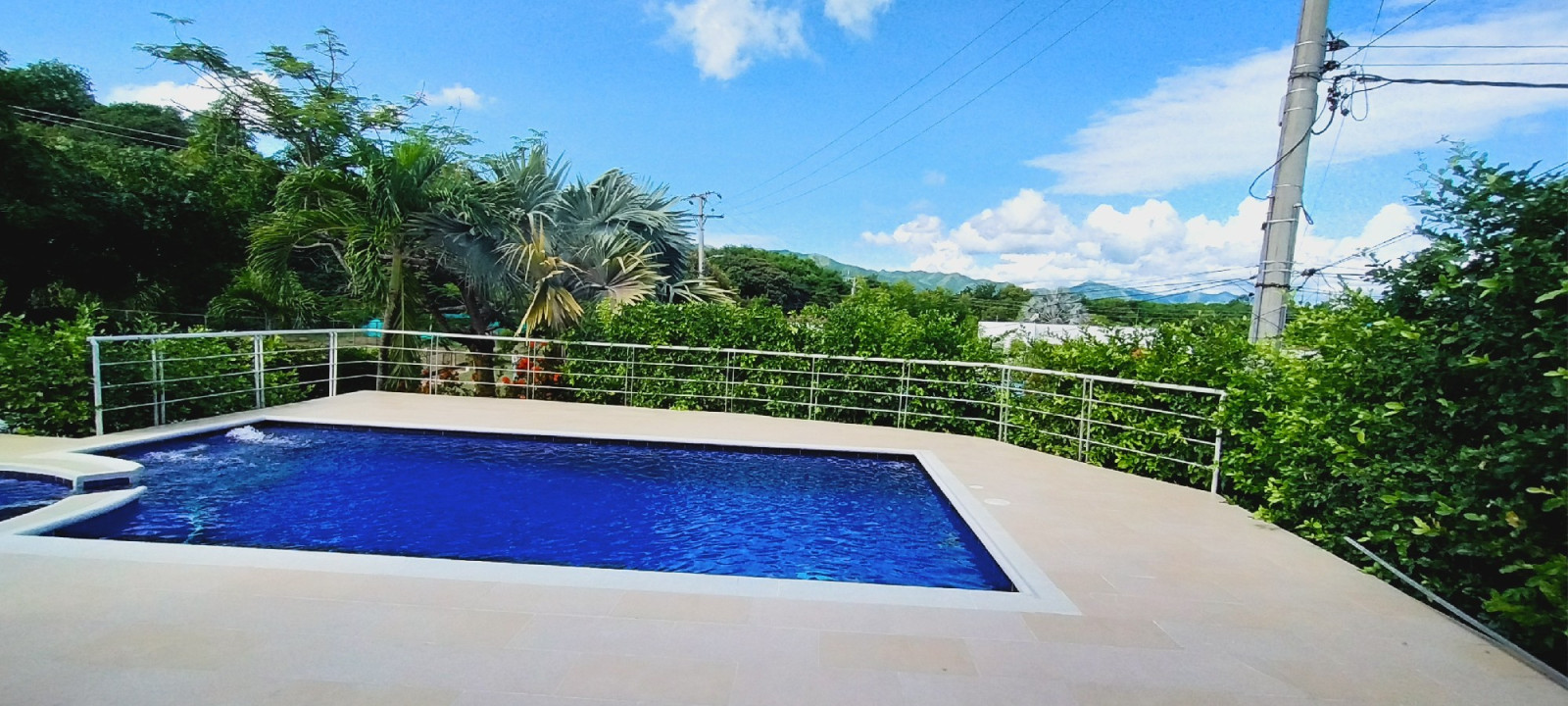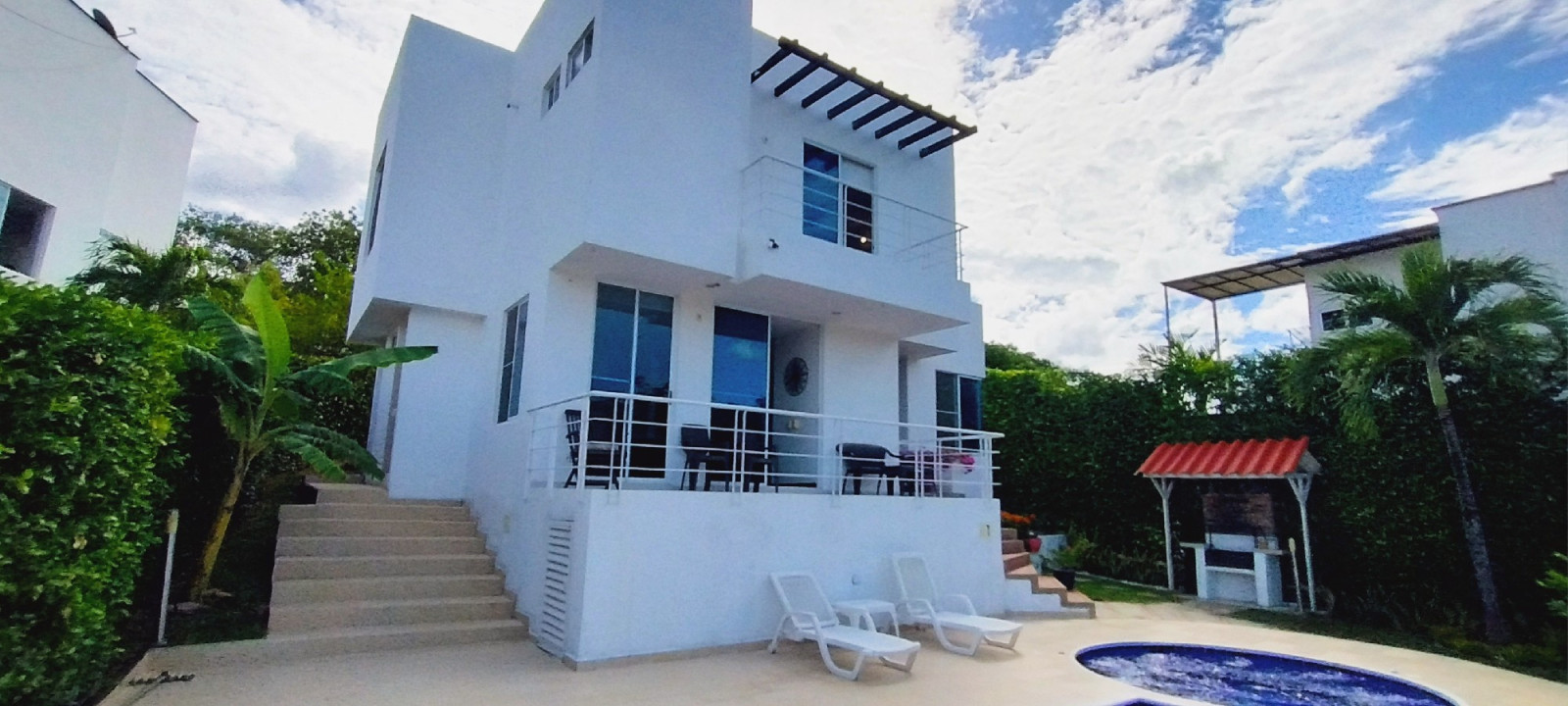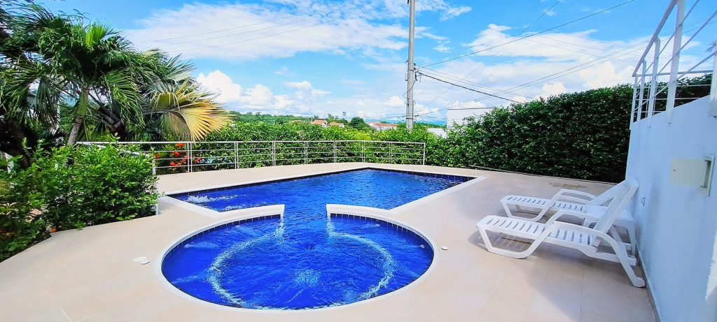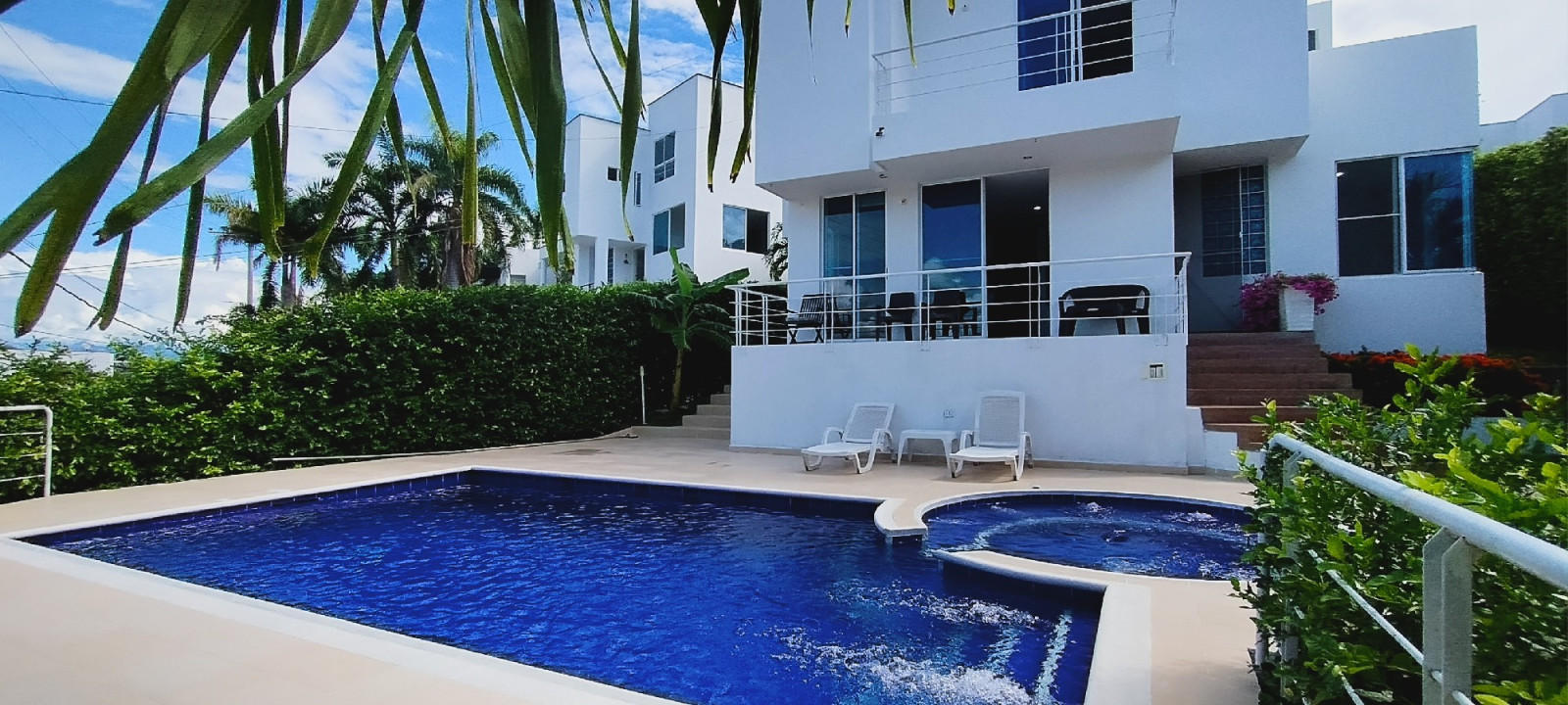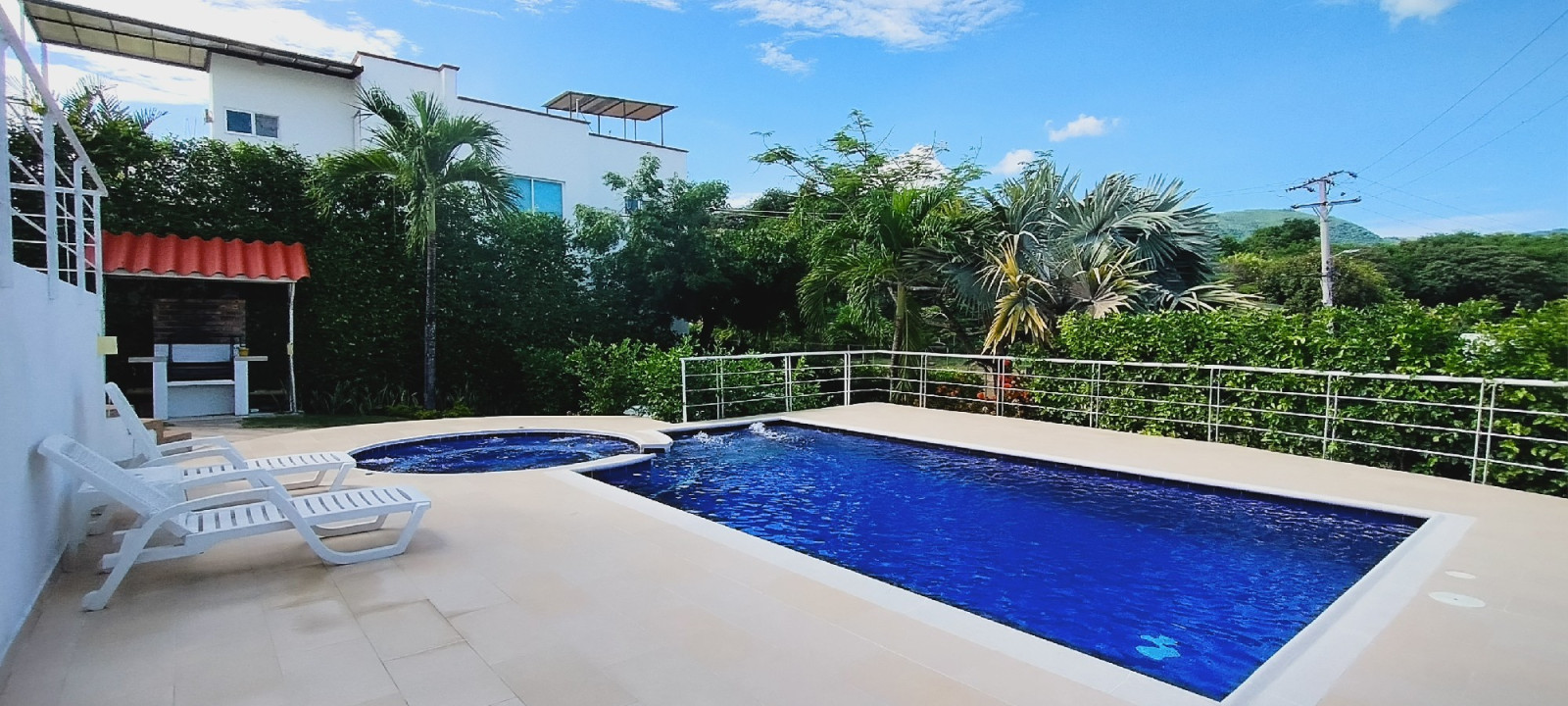 Hermosa casa en el condominio campestre Villa María, ubicado en el kilómetro cinco de Girardot, Cundinamarca. Cuenta con una construcción registrada de ciento cincuenta y cinco metros cuadrados y un lote de trescientos veinte metros cuadrados que incluye piscina privada, jacuzzi, zona de barbacoa, duchas para piscina, amplios jardines con espacio para sembrar árboles frutales y parqueadero para cuatro vehículos. En el primer nivel se encuentra la sala y el comedor en espacios independientes, una cocina abierta con zona de lavandería y un baño con ducha que funciona como baño social y como baño de servicio para la piscina. En el segundo nivel están ubicadas las cuatro habitaciones. Dos de ellas cuentan con baño privado y la habitación principal dispone de balcón con vista directa a la piscina. Las otras dos habitaciones comparten un baño completo. El condominio ofrece amplias zonas verdes, senderos ecológicos, mirador, canchas de tenis, fútbol y baloncesto, cuatro piscinas comunales, kioscos y seguridad permanente.