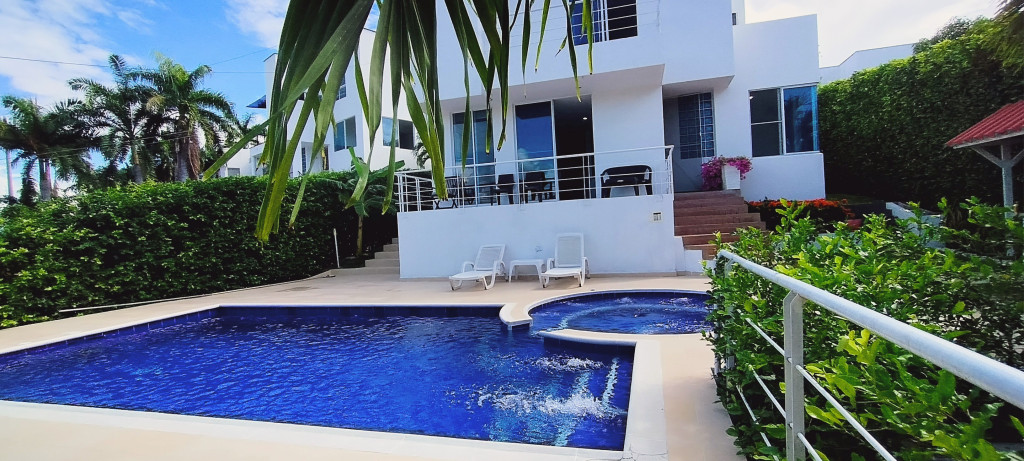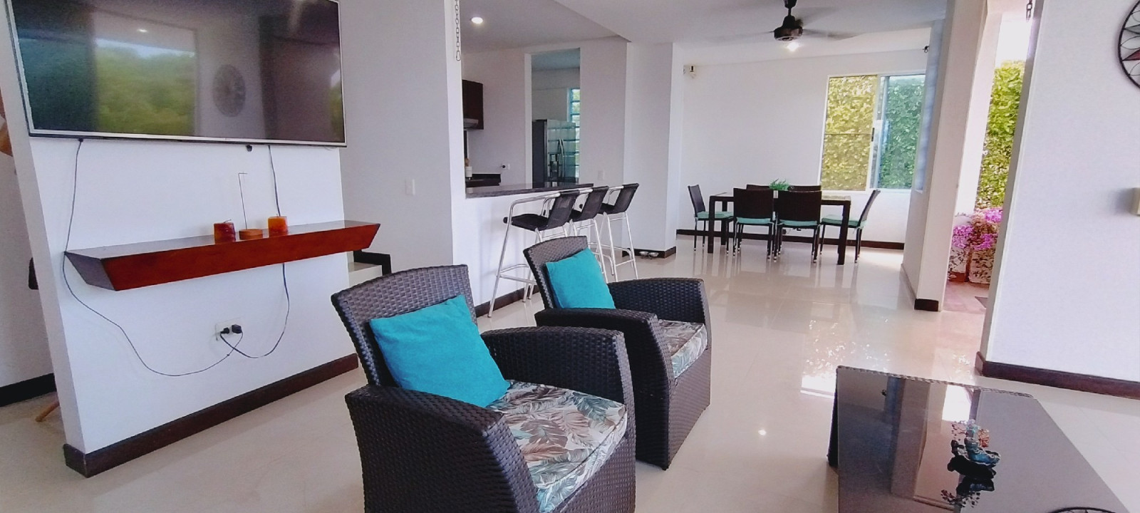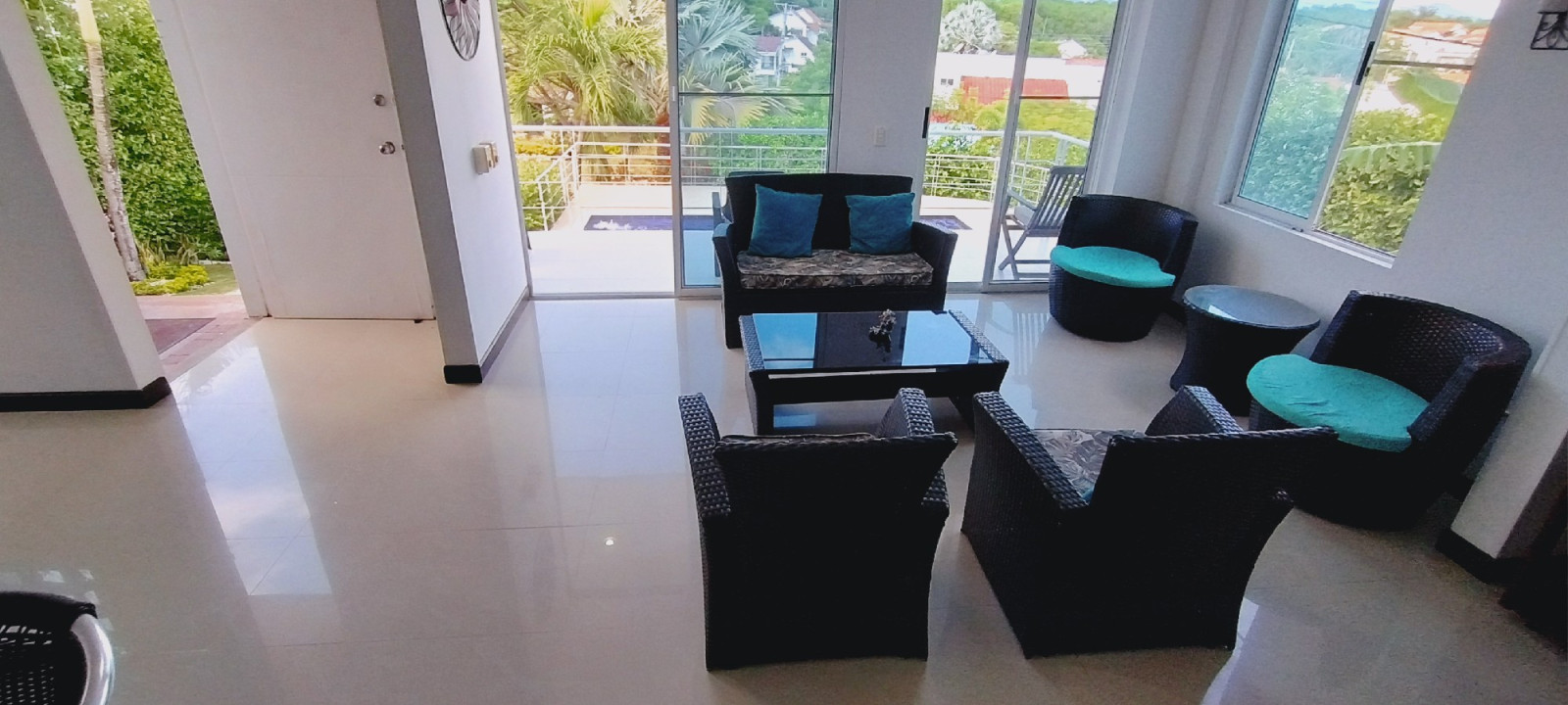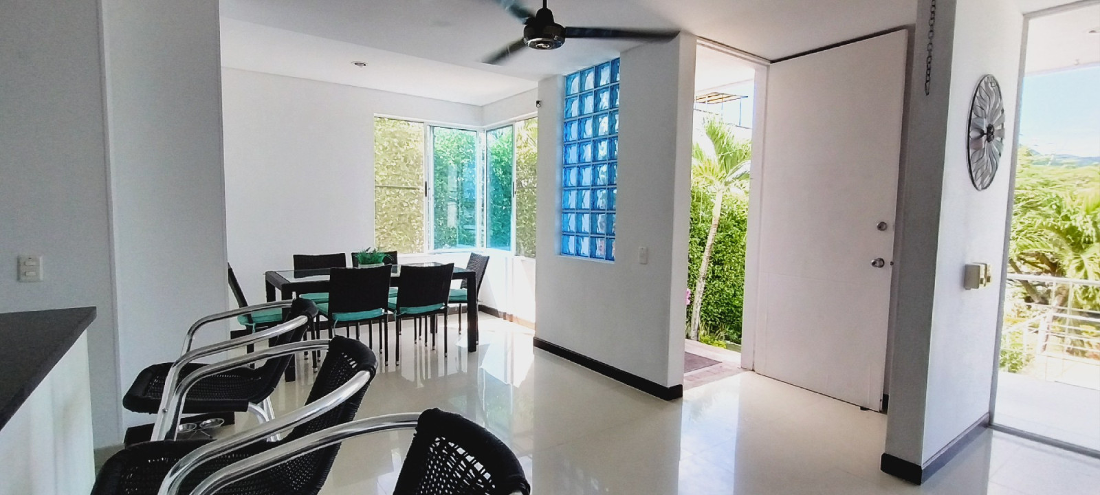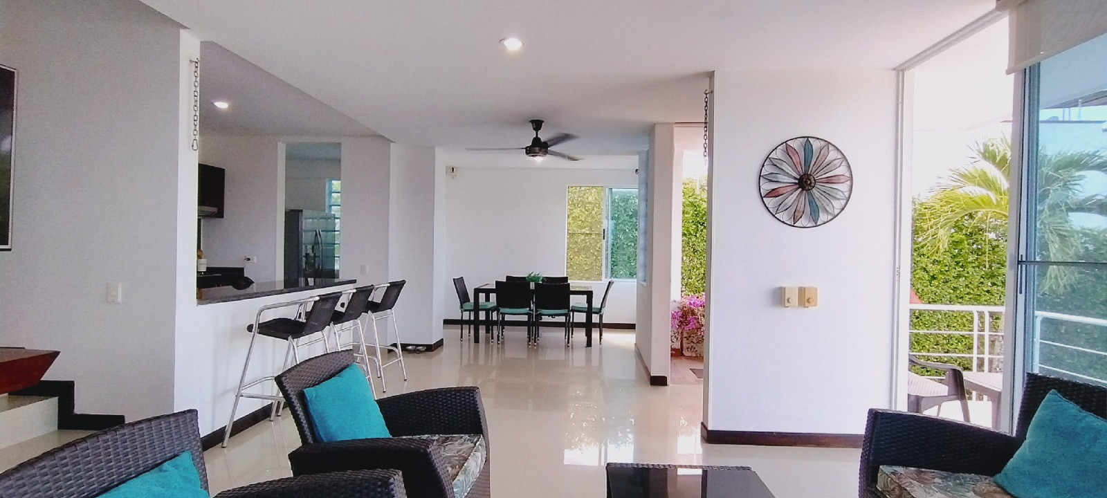 Hermosa casa en el condominio campestre Villa María, ubicado en el kilómetro cinco de Girardot, Cundinamarca. Cuenta con una construcción registrada de ciento cincuenta y cinco metros cuadrados y un lote de trescientos veinte metros cuadrados que incluye piscina privada, jacuzzi, zona de barbacoa, duchas para piscina, amplios jardines con espacio para sembrar árboles frutales y parqueadero para cuatro vehículos. En el primer nivel se encuentra la sala y el comedor en espacios independientes, una cocina abierta con zona de lavandería y un baño con ducha que funciona como baño social y como baño de servicio para la piscina. En el segundo nivel están ubicadas las cuatro habitaciones. Dos de ellas cuentan con baño privado y la habitación principal dispone de balcón con vista directa a la piscina. Las otras dos habitaciones comparten un baño completo. El condominio ofrece amplias zonas verdes, senderos ecológicos, mirador, canchas de tenis, fútbol y baloncesto, cuatro piscinas comunales, kioscos y seguridad permanente.
