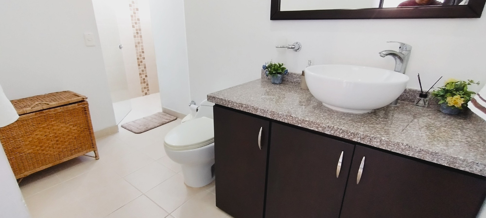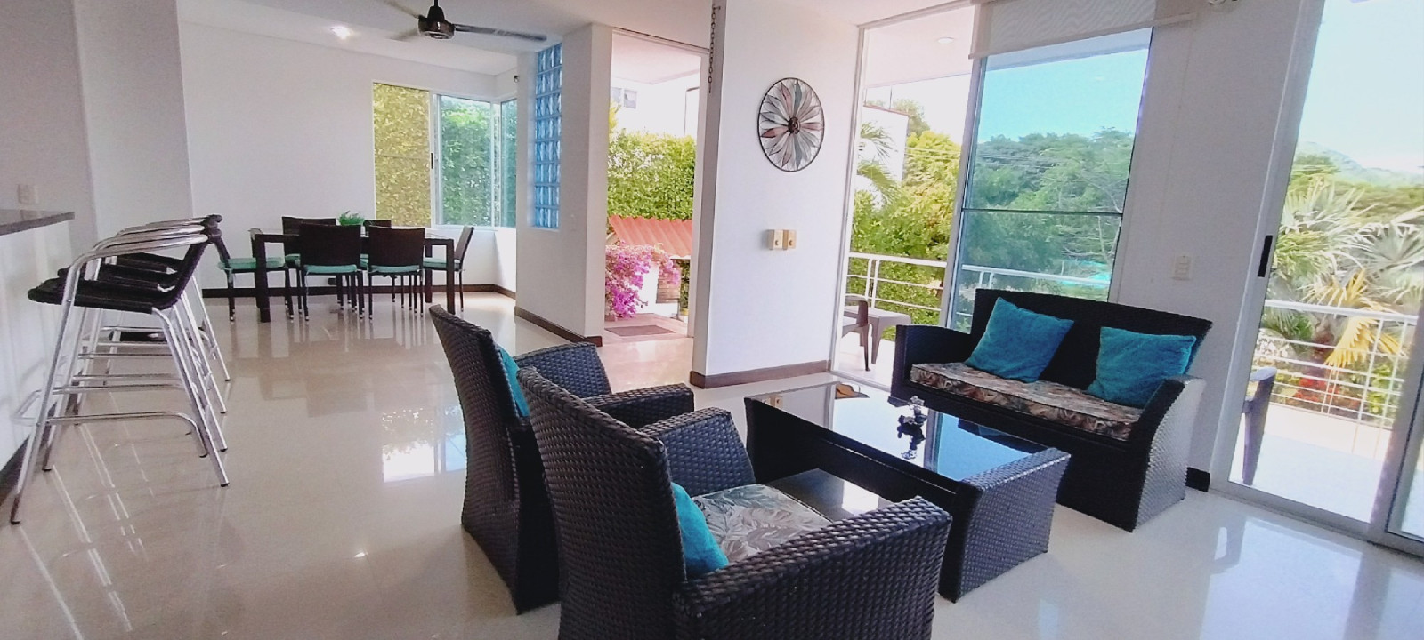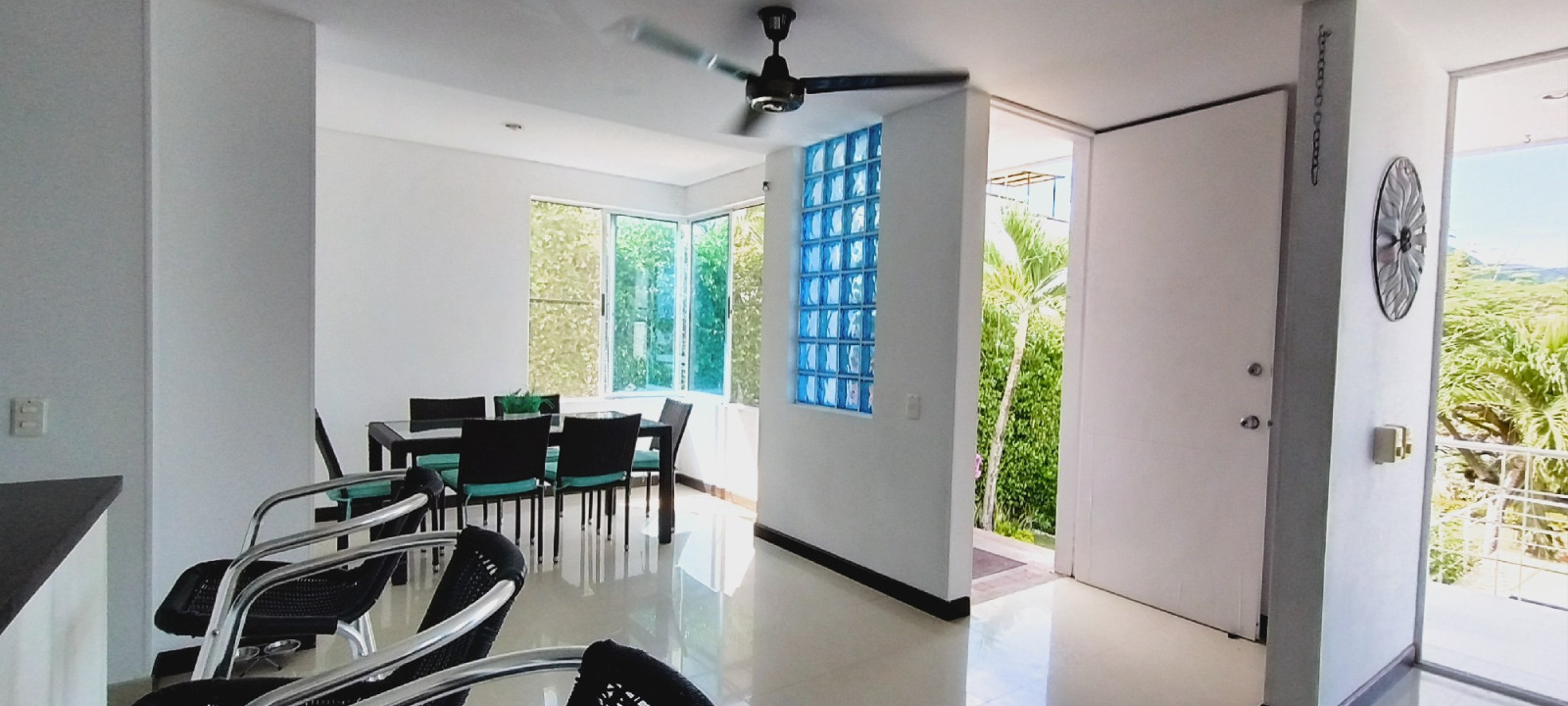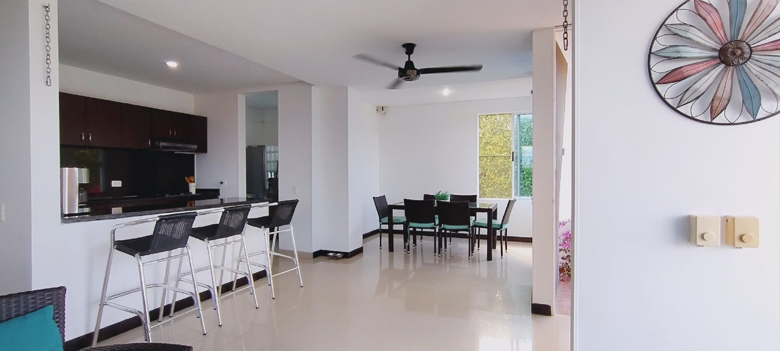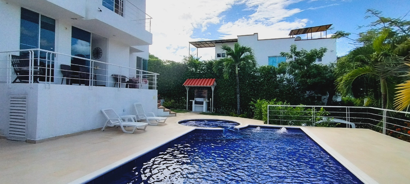 Hermosa casa en el condominio campestre Villa María, ubicado en el kilómetro cinco de Girardot, Cundinamarca. Cuenta con una construcción registrada de ciento cincuenta y cinco metros cuadrados y un lote de trescientos veinte metros cuadrados que incluye piscina privada, jacuzzi, zona de barbacoa, duchas para piscina, amplios jardines con espacio para sembrar árboles frutales y parqueadero para cuatro vehículos. En el primer nivel se encuentra la sala y el comedor en espacios independientes, una cocina abierta con zona de lavandería y un baño con ducha que funciona como baño social y como baño de servicio para la piscina. En el segundo nivel están ubicadas las cuatro habitaciones. Dos de ellas cuentan con baño privado y la habitación principal dispone de balcón con vista directa a la piscina. Las otras dos habitaciones comparten un baño completo. El condominio ofrece amplias zonas verdes, senderos ecológicos, mirador, canchas de tenis, fútbol y baloncesto, cuatro piscinas comunales, kioscos y seguridad permanente.